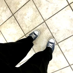 A fashion-conscious individual poses confidently against a tiled backdrop, wearing blue sneakers and navy trousers. The image conveys a sense of style and relaxed confidence.