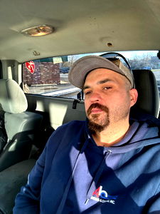 The image features a man seated inside the passenger compartment of a car, with a relaxed posture and a mustache. He is wearing a cap and a hoodie, suggesting casual attire. The vehicle appears to be outdoors during daylight hours.