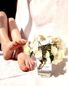 A surreal image of an OnlyFans model, Daisy, with her feet adorned in flower-themed footwear, each pedicured to perfection and each toe accented with a dainty white flower. Her toes are painted in a vibrant yellow color, complementing the delicate flowers on her feet.