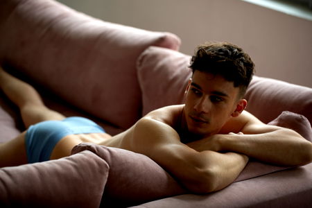A fit OnlyFans model from Spain posing shirtless, showcasing toned muscles and a chiseled physique. The young man sports short hair and is captured in an intimate pose that highlights his athletic build.