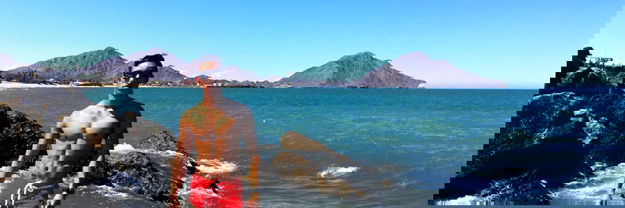 David Ace XXX is a renowned model based in Los Angeles, CA. He's known for his athletic physique and vibrant personality. In this image, he's posing on the beach with mountains in the background.