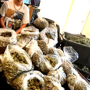 The image displays a person standing next to an extensive collection of marijuana, with several bags of marijuana and a few boxes visible. The marijuana is placed on a surface and appears to be ready for packaging or distribution.
