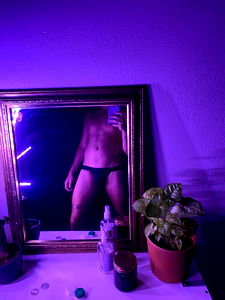 A well-lit mirror selfie of OnlyFans model Devx from Grand Rapids. The photo showcases the subject's full-body silhouette against a colorful backdrop, with a potted plant to the right and a bottle of what appears to be hand sanitizer on the sink. The model is wearing a black bikini bottom and no top, revealing toned muscles.