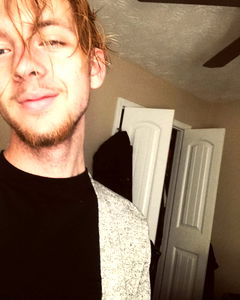 A young man with a beard and mustache is captured in this selfie, standing indoors and smiling at the camera. He's wearing a black top and his face carries a playful expression. The background shows an interior space with a door and a light-colored wall.