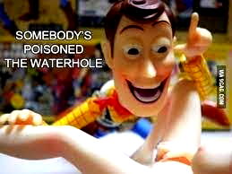 Meme featuring a cartoon character from Toy Story, overlaid with humorous text. It depicts Woody (the character) in an unexpected and humorous pose. The text reads: 'Somebody's poisoned the waterhole', adding a layer of comical absurdity to the image. This meme is often used on social media platforms for its comedic effect.