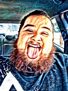 A bearded man is captured mid-exclamation, with his mouth wide open in a playful and enthusiastic manner. His facial expression suggests he's about to say or shout something. The background is blurred but appears to be an interior space, possibly a room, with hints of decorative items. His beard is full and well-groomed, adding to the youthful and dynamic vibe of the photo.