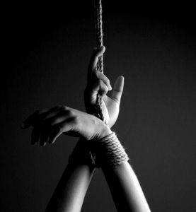 A businessman is dressed in formal attire, including a suit and tie. He is holding a noose, and his hands are tied behind his back, suggesting he is restrained or in trouble. His pose appears to be one of concern or distress.