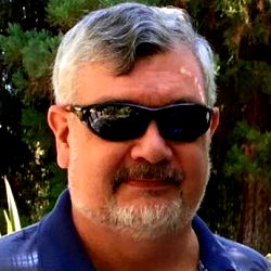 A bearded man wearing sunglasses and a blue shirt. He appears to be enjoying a sunny day outdoors.