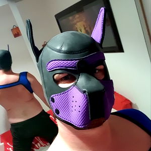 French OnlyFans model DreK68 showcasing a unique gender-revealing mask in shades of purple and black, with blue accents. This face mask adds an element of intrigue and mystery to the model's persona.