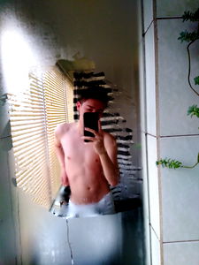 A candid photo of Drew.ve, a young adult male model and content creator from Bogotรก, captured in his home bathroom. Shirtless and leaning casually against the countertop, Drew's gaze is directed towards the camera with a confident expression.