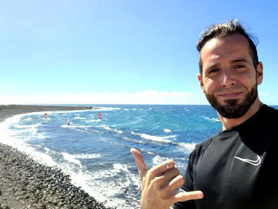 A relaxed moment captured in an outdoor setting. A man with a beard and a sporty attire, enjoying the outdoors.