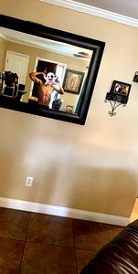 The image is a selfie of a fitness model with a mirror reflection. The individual appears to be in their 20s, male, and has muscular build. There are no visible texts or branding in the image. The background includes a home interior, such as a wall decoration and part of a couch, indicating a casual indoor setting.
