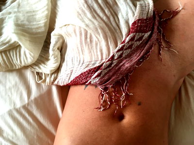 The photo shows a person laying down, covered with a white towel or sheet. The sheet appears to be tied around the waist in an unusual fashion, which stands out as it's not common to see towels used in this way. It gives the image a creative and somewhat unconventional feel. The individual is not fully visible in the photo, but we can make some observations based on the available visual information.