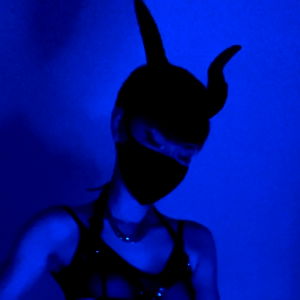 Enby Angel, an OnlyFans model, poses for a striking and edgy photoshoot with blue lighting. Wearing a devilish hat and outfit, Enby exudes a mysterious and seductive vibe.