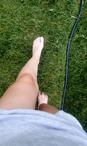 Mikayla, an OnlyFans model from Scottsdale, AZ, poses for a photo in a grassy field. The image captures her in a candid moment with bare feet and a short skirt. She is standing on a hose in the foreground, adding an element of playfulness to the scene.