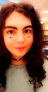 A young woman with long brown hair and a playful, colorful makeup look. She is wearing a casual top and has a bright smile on her face. Foxxie appears to be in an indoor setting, possibly a library or bookstore.