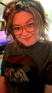 A woman with glasses and a colorful headband, wearing a t-shirt with a mountain design. She is indoors, posing for the photo. Onlyfans model name Rachel ๐ is visible.