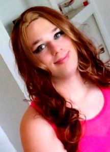 In the image, a person is seen wearing a wig and posing in front of a mirror. The individual is styled in a way that suggests they might be dressing up or perhaps preparing for an event. The background of the photo is simple, allowing the focus to remain on the subject.
