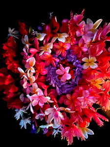 A close-up of a lush and colorful floral arrangement with red, purple, yellow and white flowers.
