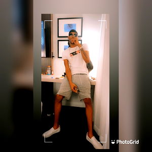 An image of a model in a relaxed pose against a bathroom backdrop. He's wearing a white t-shirt and grey shorts, paired with a low-top sneaker. The model is also holding a camera.