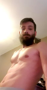 A man with a beard, showcasing his muscular physique while posing shirtless in front of a home gym. Taken from OnlyFans.