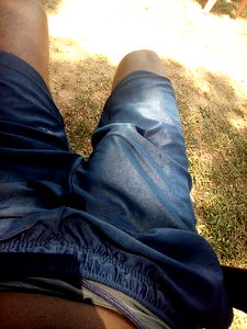 An individual is seen relaxing on a bench, dressed in navy blue swim trunks. The scene suggests a casual, leisurely atmosphere, possibly on a sunny day. The attire and the pose indicate a warm, inviting environment.