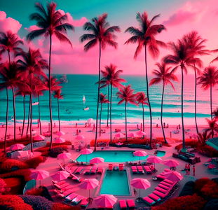 An OnlyFans model named FloridaJuicy is seen in this photo, posing against a picturesque backdrop of palm trees and ocean. She's looking away from the camera with a serene expression.