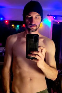 A bearded man in a black beanie and blue sweater flexing his abs, holding a phone with a Christmas tree background.