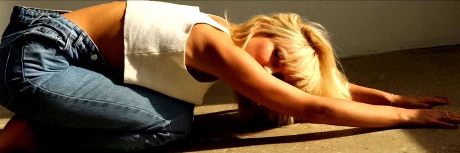 An OnlyFans model posing in a white crop top, striking an intense pose with one hand on the hip and the other on the thigh. Her blonde hair, blue eyes, and confident expression stand out against the neutral backdrop.