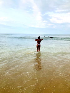 IllNaanaa, an Onlyfans model known for her confident and alluring presence, is captured in a beach scene where she exudes a carefree spirit. Her black swimsuit contrasts beautifully against the ocean backdrop, adding to the overall charm of the image.