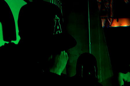 This is an image of a person posing in front of a mirror. The individual appears to be a young adult male with short hair wearing a hoodie and a colorful bandana on his head. He is holding a smartphone in one hand, which seems to be recording the photo. In the background, there is a purple room with lighting that casts an intense glow on the person. The atmosphere suggests a creative or artistic setting.