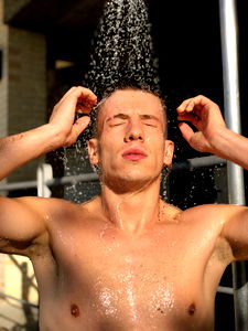 Alberto Garatachea, a popular OnlyFans model, is seen poolside wearing swim shorts. He's standing next to a swimming pool, seemingly relaxing or taking a break from his modeling duties.