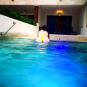Beautiful OnlyFans model JD in a swimsuit, floating on her back in an outdoor pool. Her blonde hair contrasts with the blue water, adding to the overall aesthetic of this unique photo. JD's confident posture and radiant smile create a sense of joy and relaxation.