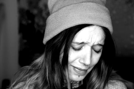 A young woman with dark hair wears a beanie and a grey hoodie, seemingly upset or crying as she looks down. She is indoors, and the background appears dimly lit.