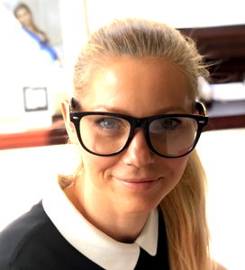 Elegant woman with glasses and a ponytail, wearing a smart blazer and looking directly at the camera.