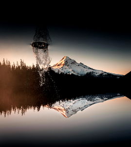 An artistic and dramatic photograph capturing the majestic beauty of a mountain, taken during twilight. The photo is slightly tilted, emphasizing the towering mountain in the background with its peak bathed in the glow of the setting sun or moonlight, reflecting on the water's surface below. The scene evokes a sense of serenity and wonder, with a hint of a mystical creature subtly visible in the foreground, adding an element of fantasy to the natural scenery. Taken by Canada-based artist Gypsy Savage.