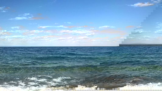 The image captures the serene atmosphere of a beach at sunset. A person, silhouetted against the backdrop of the setting sun, is strolling leisurely along the shoreline, their shadow casting a long trail behind them. The light from the sun paints a warm glow on the sandy beach and the calm sea, adding to the tranquility of the scene.