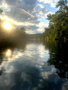 A tranquil scene of a sunrise over a lake, captured by the talented Marian. The soft glow of the sun reflects beautifully off the water's surface, creating an atmosphere of peace and relaxation. This image is a perfect representation of the beauty found in nature.