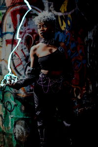 A model posing as a cosplayer. The image captures the vibrancy and creativity of cosplay culture. The model, dressed in cosplay attire and with props, is set against an urban backdrop with graffiti and wall art. This image is ideal for fans of cosplay, pop culture, and urban settings.