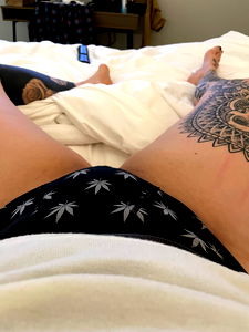 A beautiful and trendy OnlyFans model, known as Heathenmamma. Her tattoos add an edgy flair to her look. In this image, she's laying on a bed wearing black lingerie with white cannabis leaves, showcasing a casual yet alluring style. With her unique blend of personality and style, she stands out in the Midwest scene as one of the most sought-after models on OnlyFans.