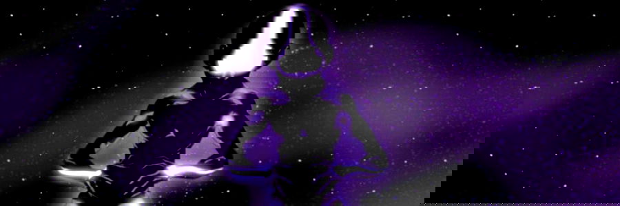 Digital artwork featuring a stylized anime character with vibrant purple hues, set against a backdrop of nebulous space and stars, evoking a sense of otherworldly exploration.