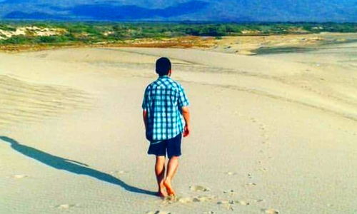 Standing by the ocean, a young male model from Mexico, DF. He's casually dressed in a red shirt and white pants.