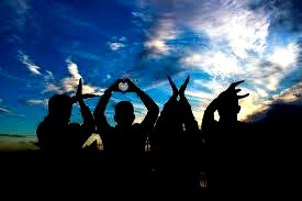 Silhouette of a person holding a camera over their head in a studio setting. The person appears to be young and is holding up peace signs with both hands. They are also making a heart shape with one hand.