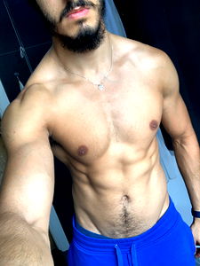A fitness model in a blue sweatshirt and shorts, shirtless with six-pack abs, striking an impressive pose for Onlyfans. #Fitness #Model #SixPack