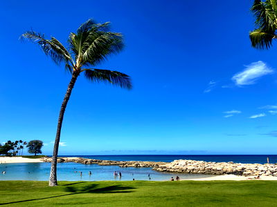An idyllic beach scene with palm trees, blue skies, and clear waters. The perfect spot to unwind and relax!