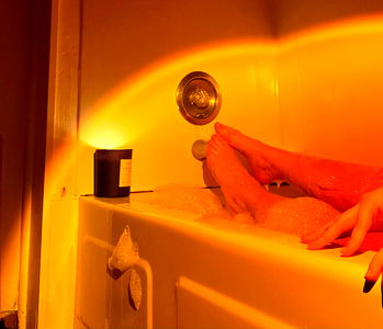 Erotic photography of OnlyFans model relaxing in a bathroom, focusing on the feet and toes. The model is partially submerged in a warm bath, emphasizing the wet feet. This scene evokes a sense of luxury and relaxation.