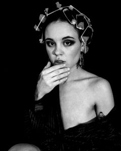 In this black and white portrait, the model exudes an air of sophistication and confidence. Her gaze is intense, drawing the viewer in with her captivating expression. She stands against a plain background, allowing her to be the sole focus of this image.