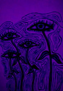 This image showcases a colorful piece of abstract art, featuring an intricate design composed of multiple eyes and facial features. The artwork is rich in detail, with the dominant purple hue creating a striking contrast against the white background. It's a unique blend of modern art styles that seems to evoke a sense of wonder and creativity. Ioana's artistic skills are on full display here.