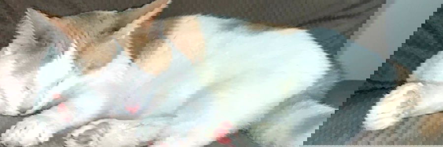 A peaceful scene of a brown and white cat sleeping comfortably on a sofa in what appears to be a cozy home. The feline is lying on its side, head resting on its front paws, suggesting a state of relaxation and contentment.
