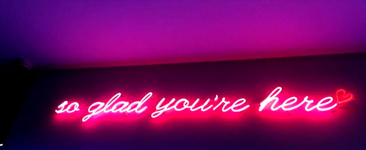 An illuminated neon sign with a heartfelt message, likely a welcoming statement in a bar or restaurant named 'Destiny'. The sign has a retro pink and blue hue, suggesting a themed or nostalgic setting. It's placed against a purple wall with a hint of a person's silhouette on the left side.